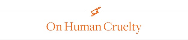 “I do not believe any animal is capable of being cruel. Cruelty implies consciousness of another’s pain and the intent to cause it. Cruelty is a human specialty, which human beings continue to practice, and perfect, and institutionalize, though we seldom boast about it. We prefer to disown it, calling it ‘inhumanity,’ ascribing it to animals. We don’t want to admit the innocence of the animals, which reveals our guilt.”
